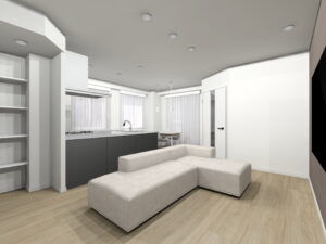 3つの窓がある明るく爽やかな洋室1をLDKに取り込むプランを考えました。